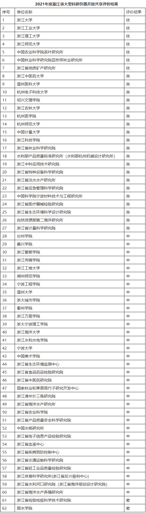附件:2021年度浙江省大型科研仪器开放共享评价结果